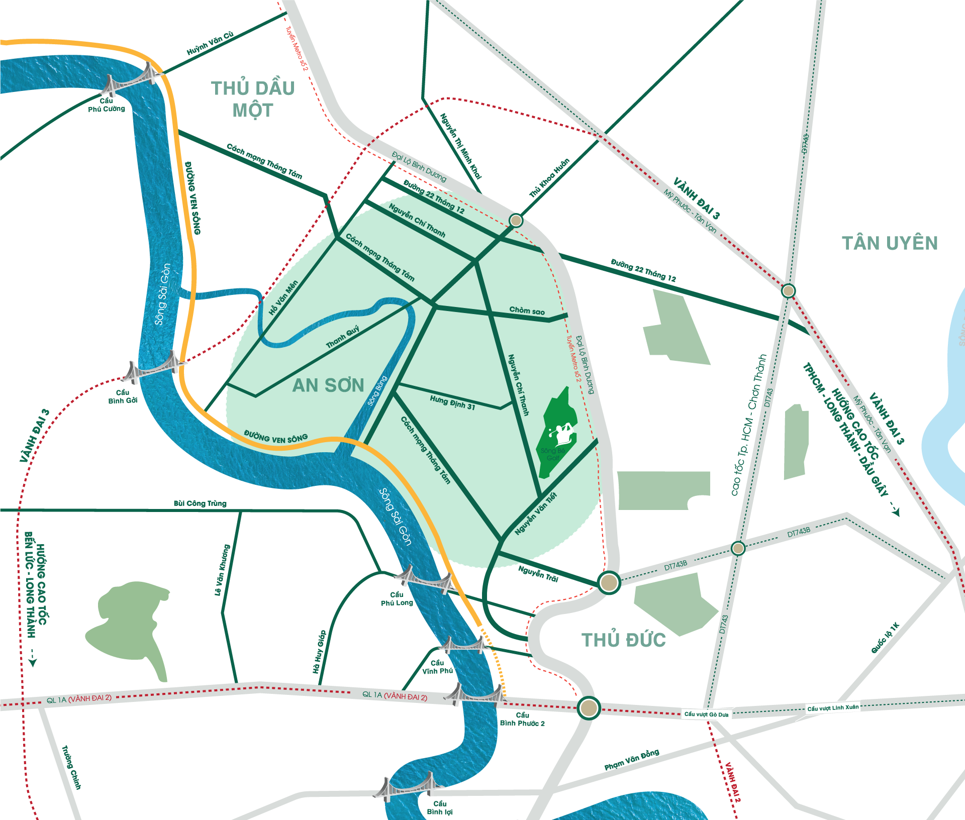 Tiếp nối tinh thần ấy, The Emerald Garden View toạ lạc tại trung tâm Thuận An, nằm trên trục Đông – Tây chiến lược, liền kề Quốc lộ 13, Vành đai 2 – 3 và chỉ vài phút đến metro, sông Sài Gòn, sân bay Long Thành.